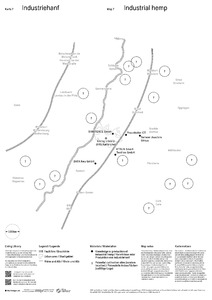 Orte, die sich auf das Wissen oder die Produktion von Industriehanf spezialisiert haben (gefüllte Punkte), und potenzielle, zufällig gelegene Gebiete für den Anbau von Industriehanf innerhalb der Bioregion Karlsruhe (gepunktete Kreise mit Fragezeichen). Im Rahmen des Lehrprogramms »Über Tradition und Wandel« wurden zwei Standorte besucht: der Produzent BAFA Neu und der Seilmacher Joachim Dittus. Da der Hanfanbau strengen Vorschriften unterliegt, werden die genauen Standorte der Felder nicht öffentlich bekannt gegeben und konnten daher nicht besucht werden. Obwohl die ungefähre Anzahl der Anbauflächen innerhalb der Bioregion aus landwirtschaftlichen Statistiken geschätzt werden kann, bleiben ihre genauen Positionen unbekannt und werden hier als zufällige Standorte dargestellt.