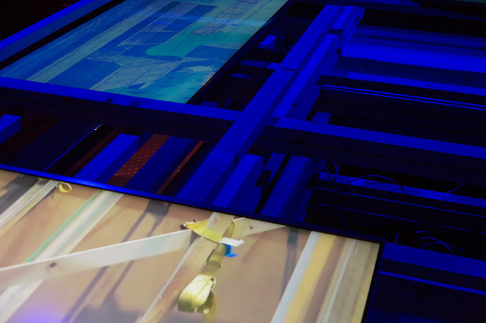 Die Installation Test Drive besteht aus einem 4-Kanal-Video, Sound und einer quadratischen Konstruktion (ca. 3,0 x 3,0 x 1,0 m) aus Holz, Stahlprofilen, Rigipsplatten und Bildschirmen. Die unterschiedlich angeordneten Bestandteile des Displays sind in mehreren Schichten übereinandergelegt und bilden ein Tragwerk