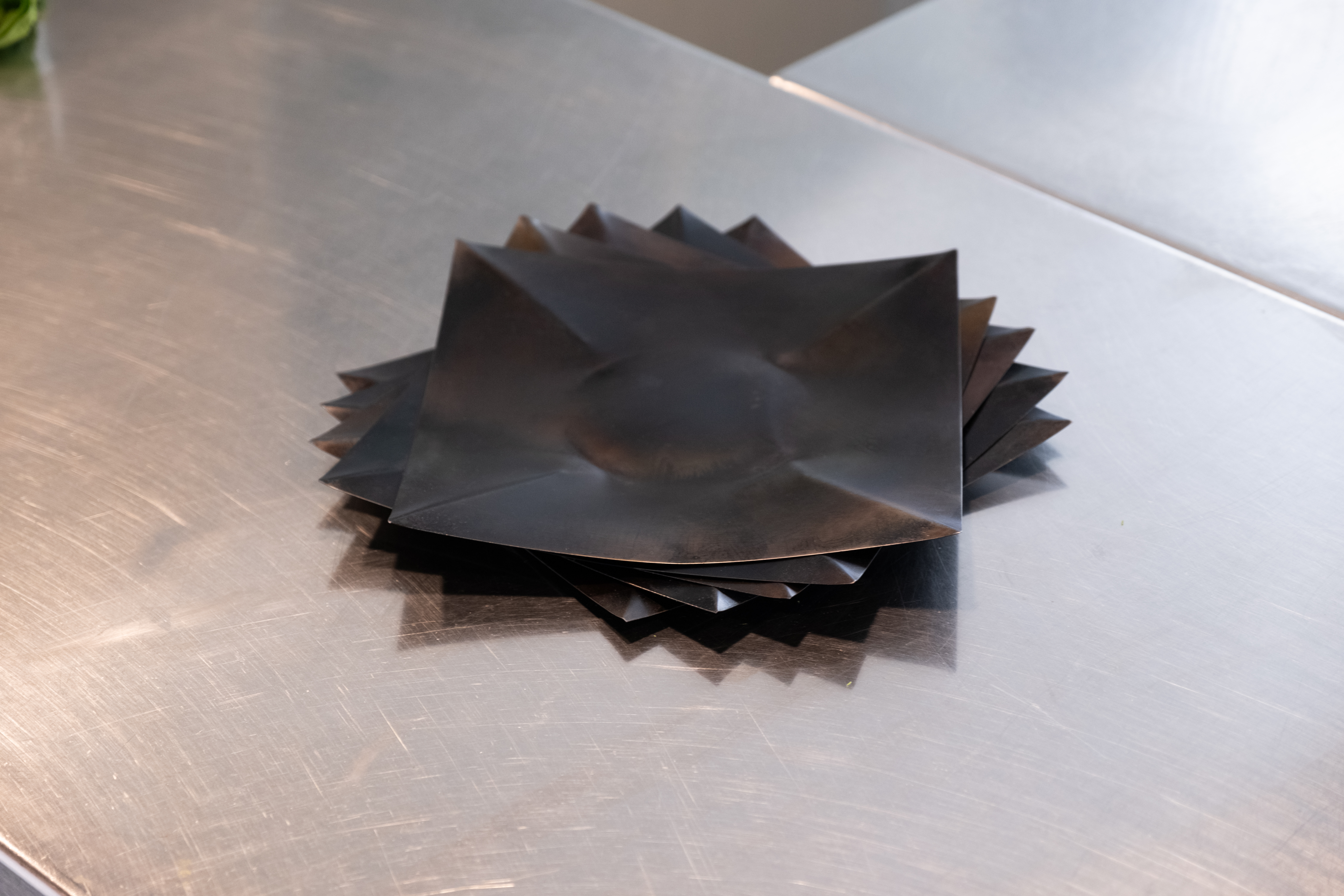 Das Foto zeigt eine Teller-Serie aus aufeinander gestapelten Stahlblechen. Bei der Herstellung wurde ein Phänomen in der Blechbearbeitung genutzt, bei dem durch Verformung Spannung im Material aufgebaut wird. Wirkt man dieser Spannung mit Kraft entgegen, springt das Blech mit einem hörbaren Knacken in die entgegengesetzte Form um.