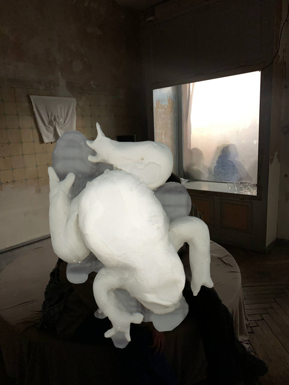 Isolated object: Light-colored ceramic toad covered with a layer of wax. A dark room in the background. A fabric hangs on the wall, people can be seen behind a window pane.