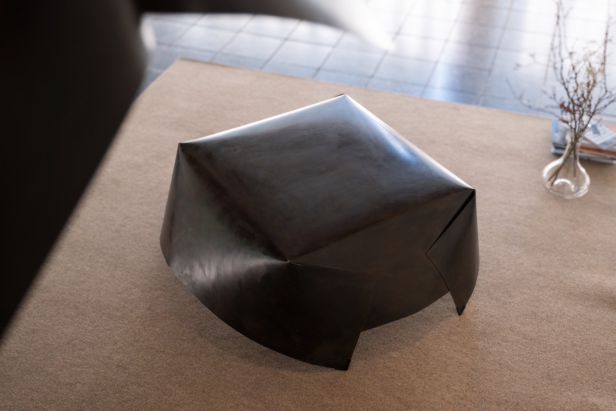 The photo shows a coffee table made of sheet steel, manufactured using the "shell" technique. Four folds form the legs. At the same time, these folds create a flat, tensioned table surface.