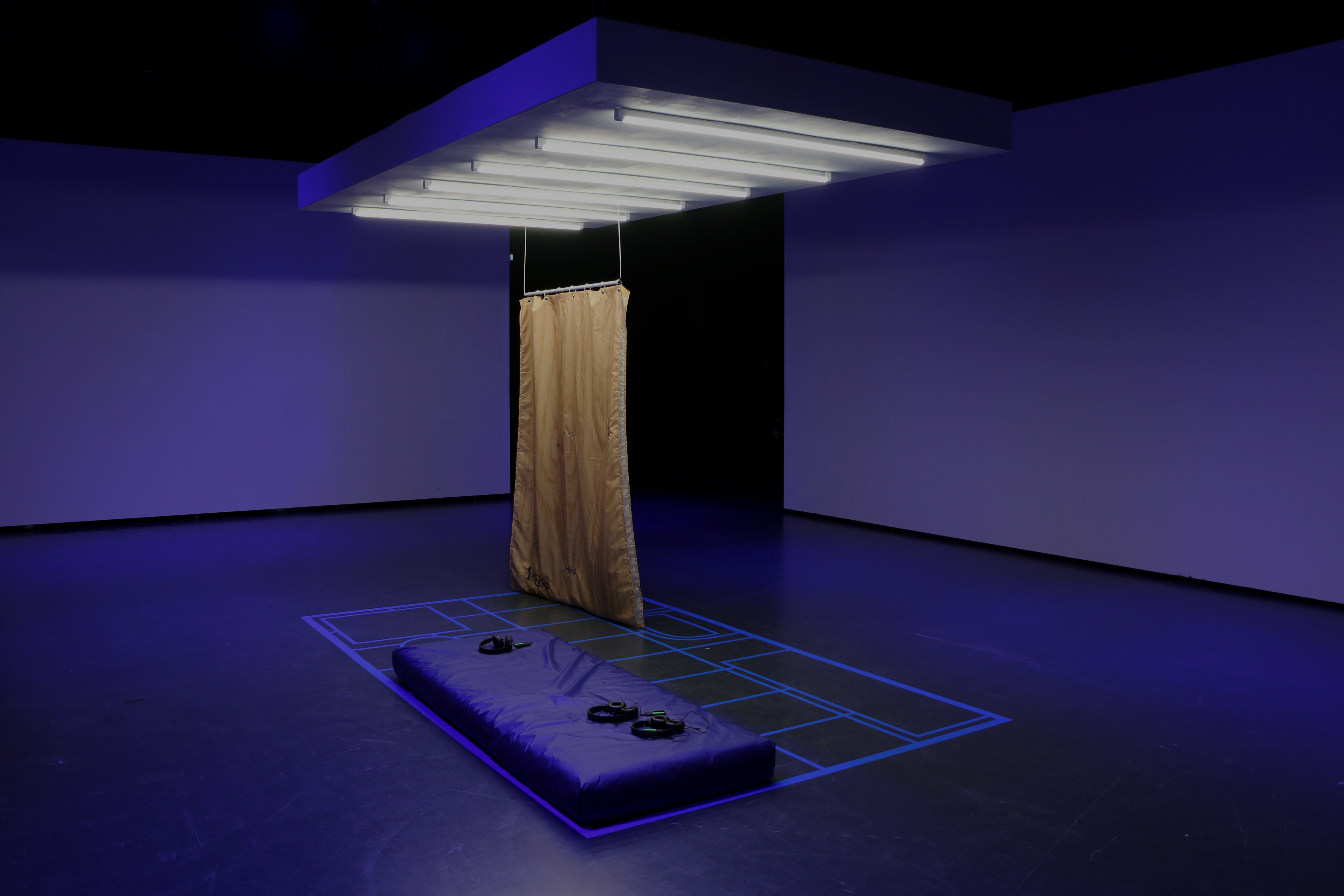 View into the exhibition; Taped floor plan of the 7sqm, shower curtain/ Schamvorhang "shame" curtain, suspended ceiling with LED fluorescent tubes, exhibition walls, video projections.