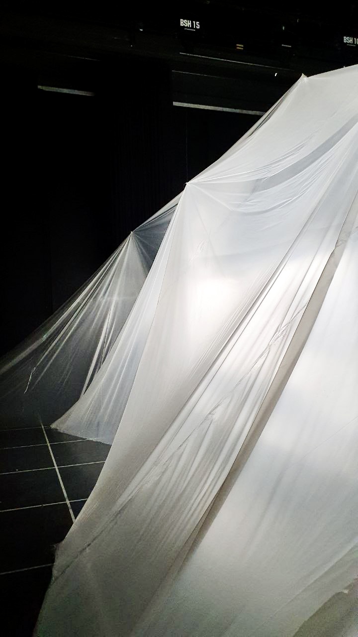 Anstelle jedoch das Dispositiv einer ‚klassisch (natur-)wissenschaftlichen‘ Ausstellungsgestaltung zu bemühen, resultierte die achtmonatige Auseinandersetzung mit Mycelium und dessen Kultivierung in einer multi-medialen Installation, die zwischen Fremdheit, Affizierung und Mehrstimmigkeit oszillierte. So entfaltete sich eine halbtransparente, amorphe Form im Dunkeln während Visuals wachsender Hyphenfäden an den Wänden entlangkrochen. In der Mitte des Gebildes prangte ein leuchtend-weißer Würfel, dessen Inneres an ein steriles Labor erinnerte. Um hineinzugelangen, mussten sich die BesucherInnen selbst einem „Reinigungsprozess“ unterziehen, indem sie weiße Schutzanzüge, klinische Handschuhe und Schuhüberzieher anlegten. Wer nun genau sich vor wem in diesem utopisch-dystopischen Arrangement schützte, blieb bewusst unbeantwortet. So wandelten die Gäste in jener szenografischen Ambiguität aus wissenschaftlich-aufklärerischem White-Cube und dunkel affizierender Blackbox während eine anschwellende, polyphone 4-Kanal Soundebene die Szenerie untermalte.