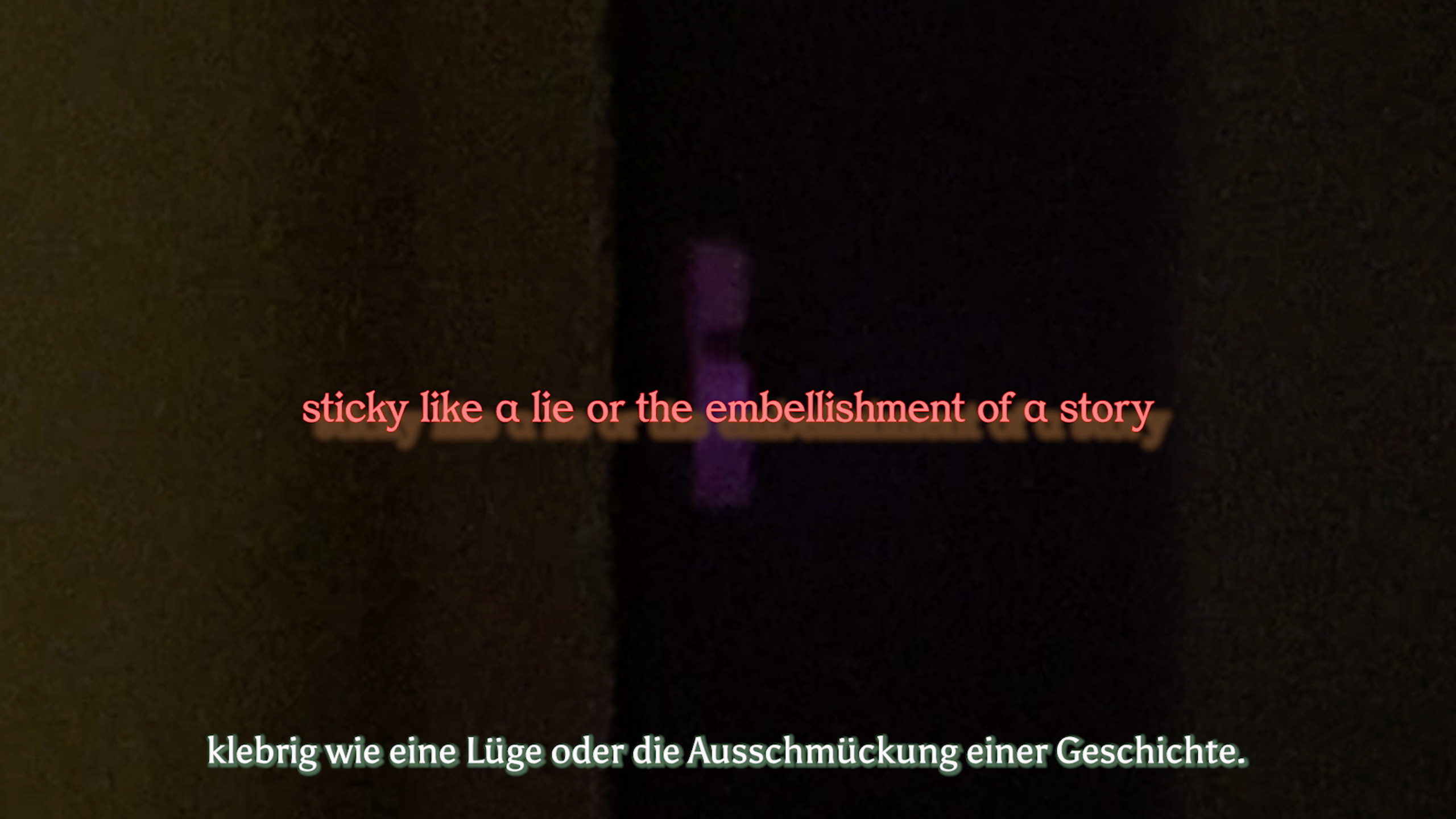 Videostill: Dunkler verschwommener Hintergrund. In der Mitte des Bildes steht in lachsfarbener Schrift: „sticky like a lie or the embellishment of a story.“ Am Bildrand unten steht in heller Schrift: „klebrig wie eine Lüge oder die Ausschmückung einer Geschichte.“