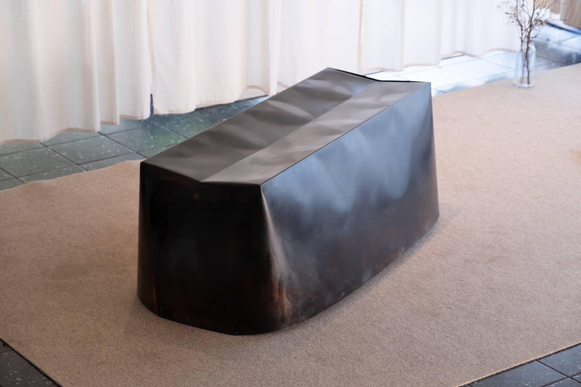 Die Bank vereint zwei verschiedene Falttechniken der Stahlblechbearbeitung. Die Sitzfläche wird durch zweidimensionale Kanten geformt, der untere Teil zu übereinandergeschobenen Flächen. Dadurch läuft die rechteckige Sitzfläche zu einer ovalen Form richtung Boden.